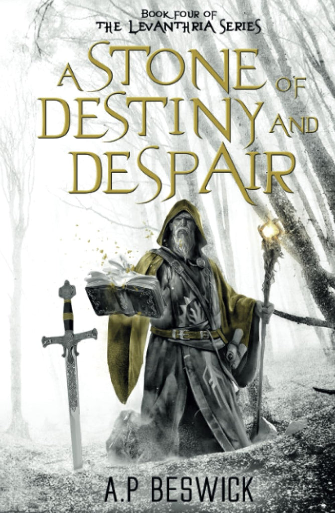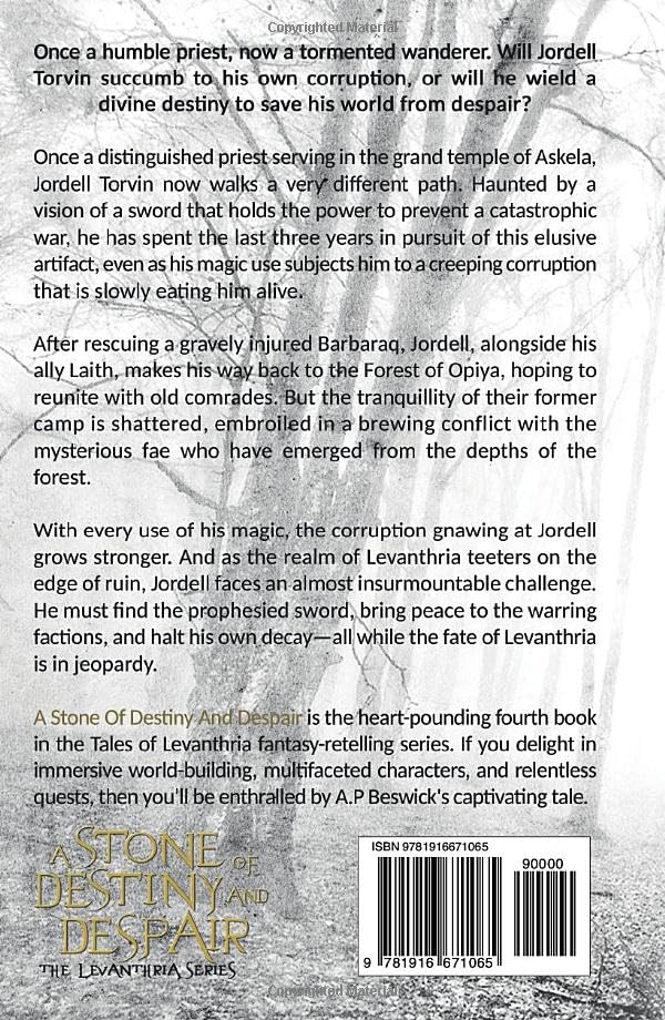 Once a humble priest, now a tormented wanderer. Will Jordell Torvin succumb to his own corruption, or will he wield a divine destiny to save his world from despair?Once a distinguished priest serving in the grand temple of Askela, Jordell Torvin now walks a very different path. Haunted by a vision of a sword that holds the power to prevent a catastrophic war, he has spent the last three years in pursuit of this elusive artifact, even as his magic use subjects him to a creeping corruption that is slowly eating him alive.After rescuing a gravely injured Barbaraq, Jordell, alongside his ally Laith, makes his way back to the Forest of Opiya, hoping to reunite with old comrades. But the tranquillity of their former camp is shattered, embroiled in a brewing conflict with the mysterious fae who have emerged from the depths of the forest.With every use of his magic, the corruption gnawing at Jordell grows stronger. And as the realm of Levanthria teeters on the edge of ruin, Jordell faces an almost insurmountable challenge. He must find the prophesied sword, bring peace to the warring factions, and halt his own decay-all while the fate of Levanthria is in jeopardy.A Stone Of Destiny And Despair is the heart-pounding fourth book in the Tales of Levanthria fantasy-retelling series. If you delight in immersive world-building, multifaceted characters, and relentless quests, then you’ll be enthralled by A.P Beswick's captivating tale.